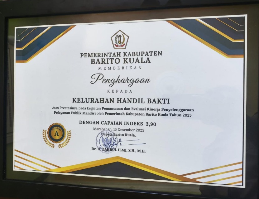 Selamat Kepada Kelurahan Handil Bakti atas Penghargaan Kategori A atas prestasi pada kegiatan Pemantauan dan Evaluasi Kinerja Penyelenggaraan Pelayanan Publik Mandiri oleh Pemerintah Kabupaten Barito Kuala Tahun 2025.